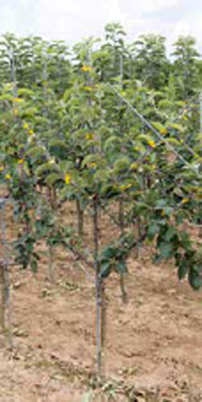 Cycle d’élevage de 4 ans. Greffées sur un intermédiaire pour former un tronc esthétique, les variétés sont greffées en tête la dernière année de pépinière. 3 calibres principaux à la vente : 6/8, 8/10, 10/12 (mesure en centimètre la circonférence du tronc à 1 mètre du sol). La fructification est abondante et rapide, la récolte aisée. Forme très répandue alliant productivité et joli visuel.